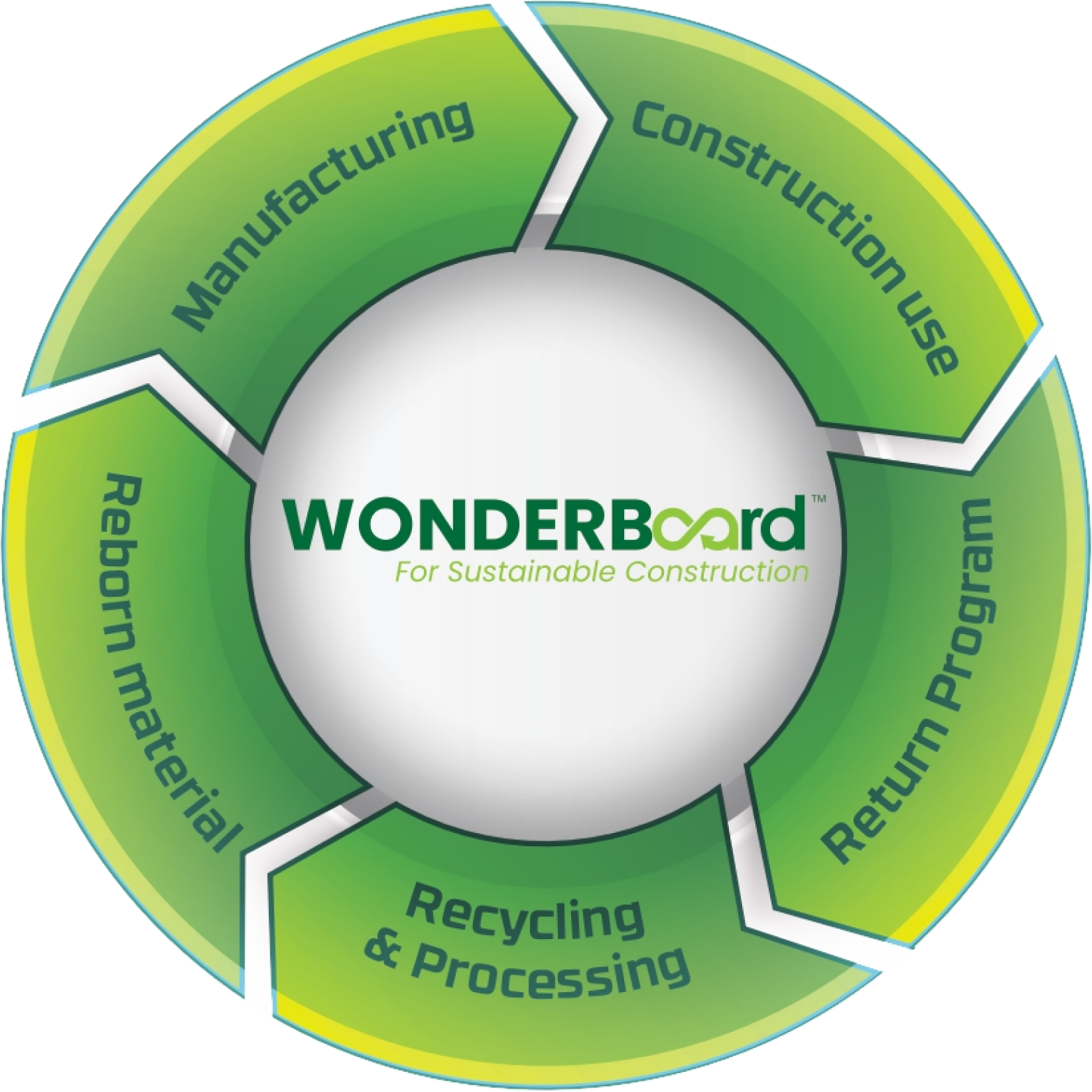 Returned Wonderboard™ panels are collected, recycled, and re-engineered into new boards under a closed-loop circular economy system.